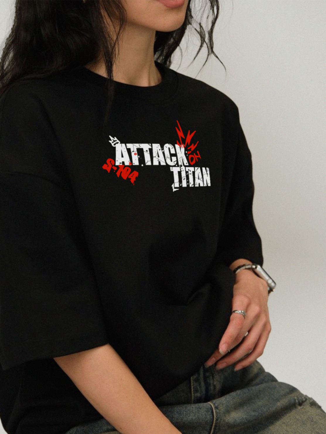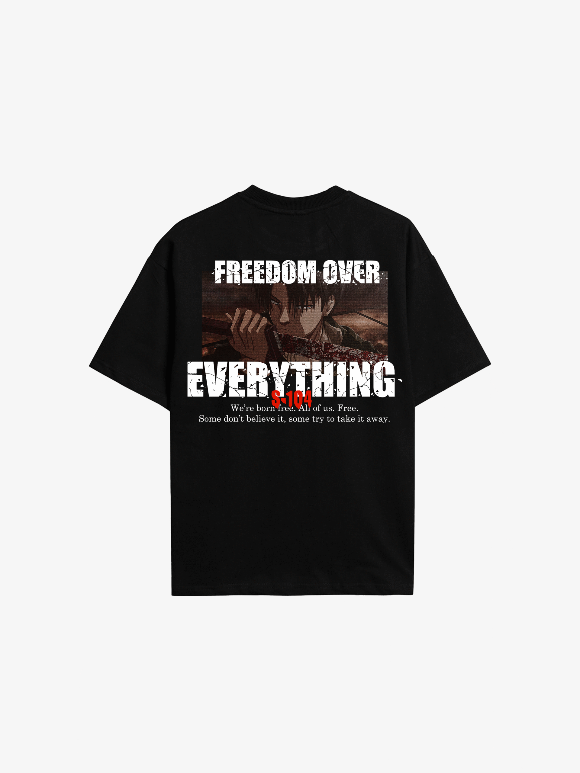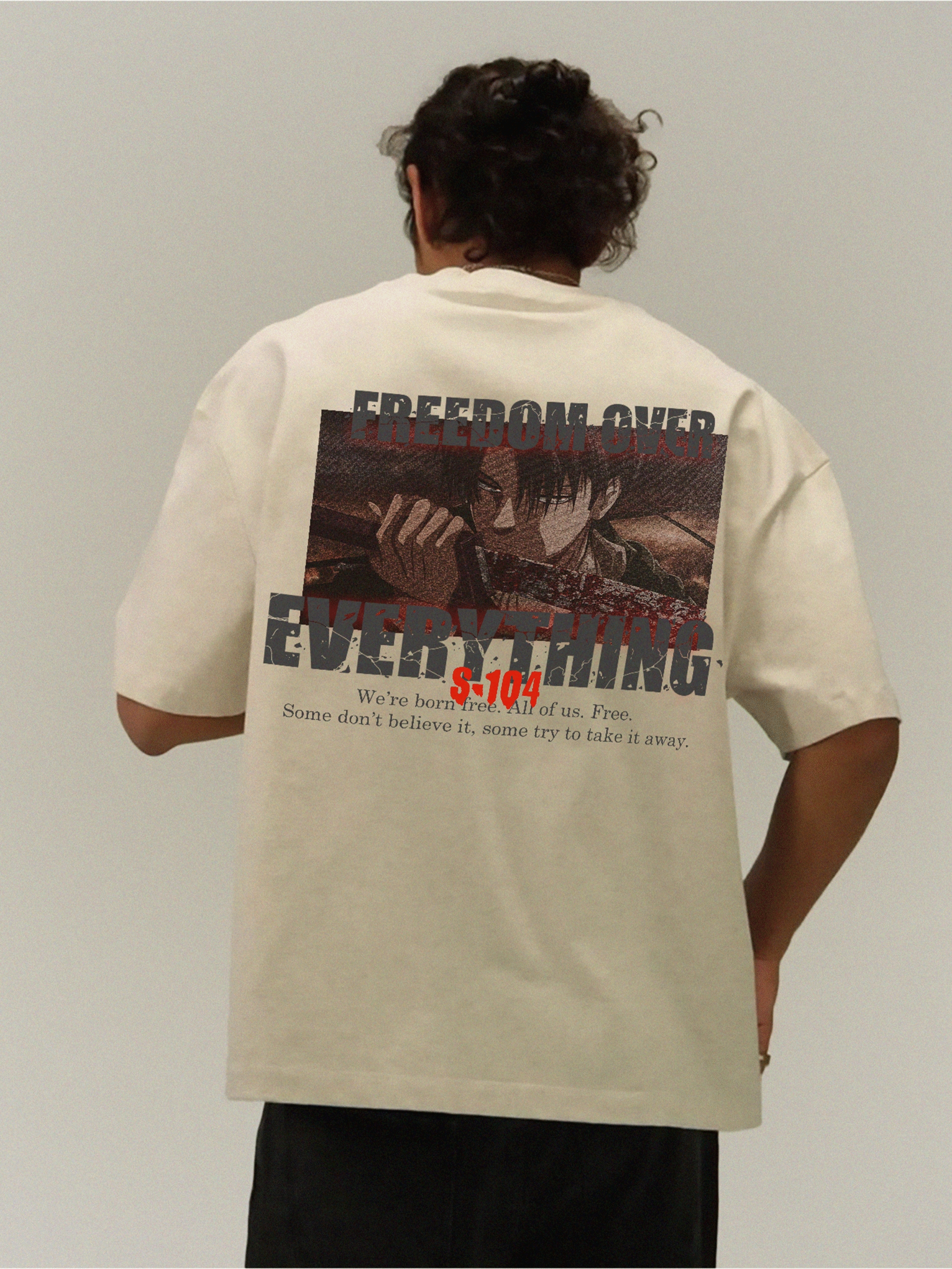 The attack on titan s-104 branding on front while having  BOLD dtf graphics on the back is made from 100% premium cotton, oversized and unisex fit.