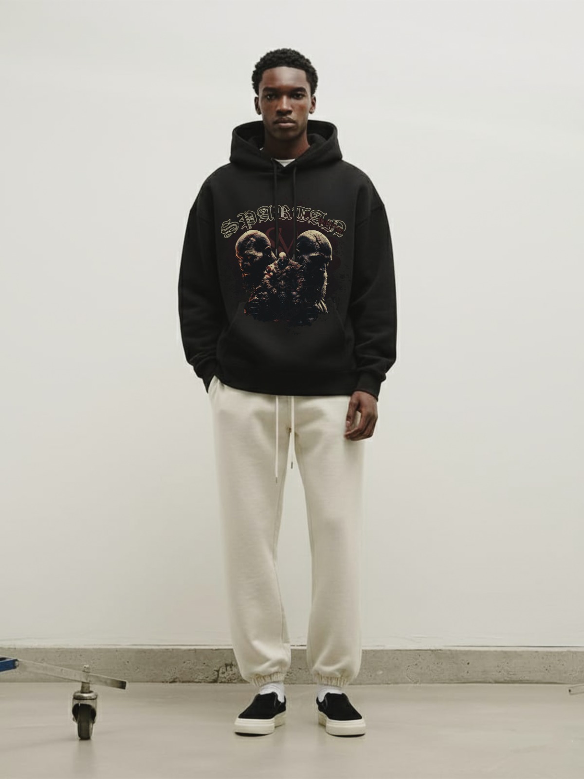 The front features an immersive KRATOS artwork in distressed vintage tones, while the silhouette is finished with ribbed cuffs, a reinforced hood, and a spacious kangaroo pocket.